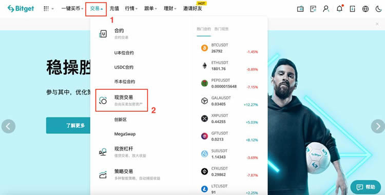 4. 登录完回到首页,点击交易-现货交易,进入交易页面
