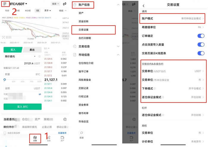 1)想要进行合约交易需要将账户模式开通并设置为单币种保证金模式或跨币种保证金模式。