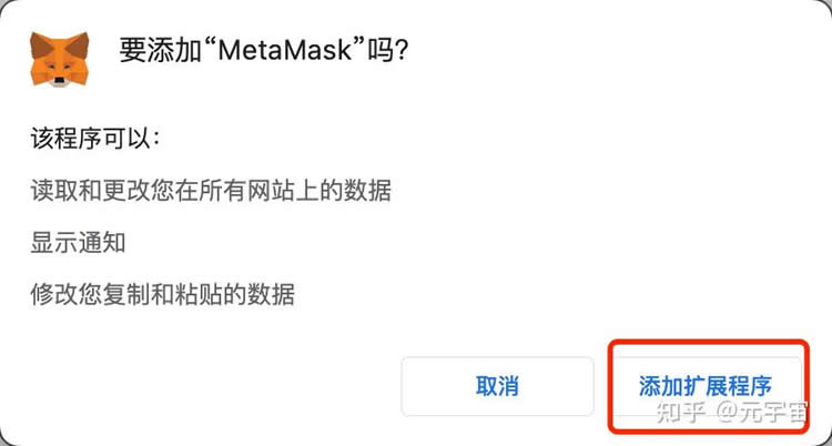 3、点击“添加至Chrome”,在确认界面点击“添加扩展程序”,即可将小狐狸钱包安装至Chrome浏览器。