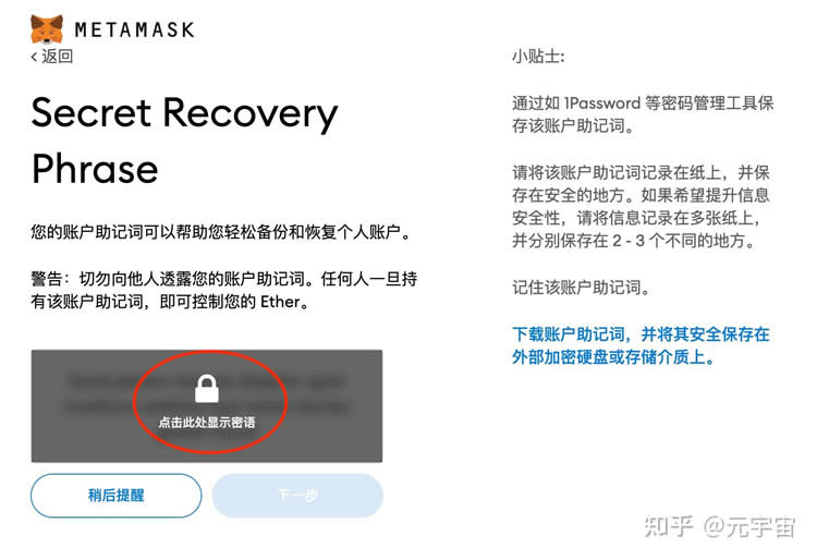 4、接着会提示你看一段保管助记词的视频,这里是最最最重要的一步,点击“点此处显示密语”生成助记词,系统会随机生成12个英文单词,助记词是帮助你备份和恢复钱包的最最最重要的关键,一定要妥善保管,建议立刻将这十二个单词手抄记录于纸张,并保存在安全的地方(更稳妥的做法是记录在多张纸上分别保存在2~3处),不可拍照、截图、存储于网络或随意透露给他人,否则你很可能会失去钱包的所有控制权!!!丢失后没有任何人能帮你把币找回来,包括MetaMask钱包官方!!!