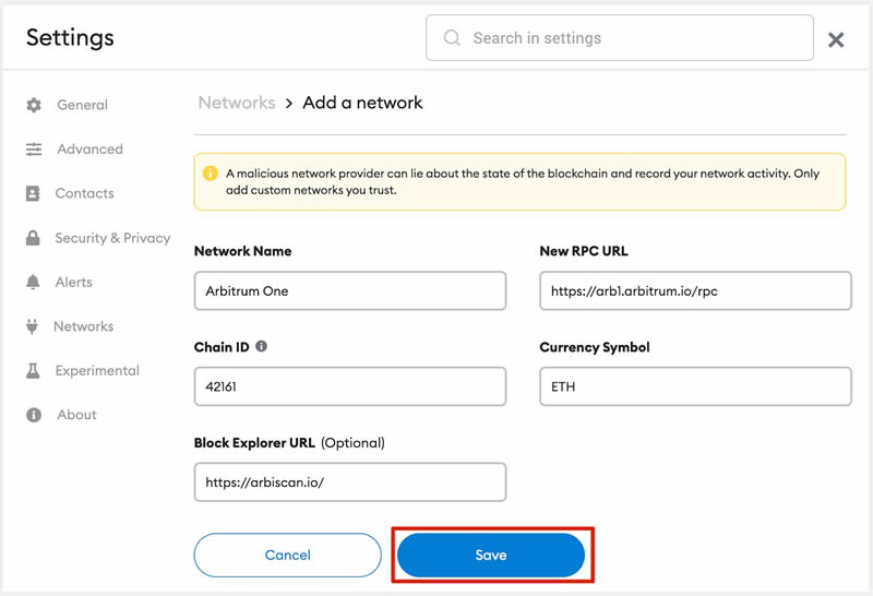 2.[Add network] 页面打开后,请添加 Arbitrum Network 详细信息(本文开头有提及),完成后单击 [Save]。
