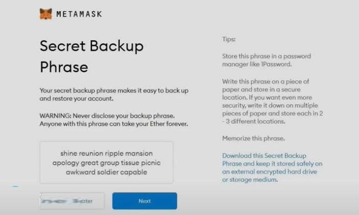 注意:此短语不应共享*。*任何拥有此助记词的人都可以收回和使用您的资金。有关如何保存此密码的提示。花时间备份您的短语并将其存储在安全的地方。