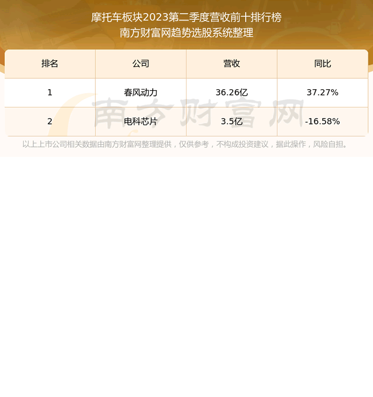 按照趋势选股系统统计,该股所属板块为摩托车板块,该板块共有2只股票,新日股份2023第二季度营收在该板块中排名为第2名,该板块2023第二季度营收排名前十的股票如下表: