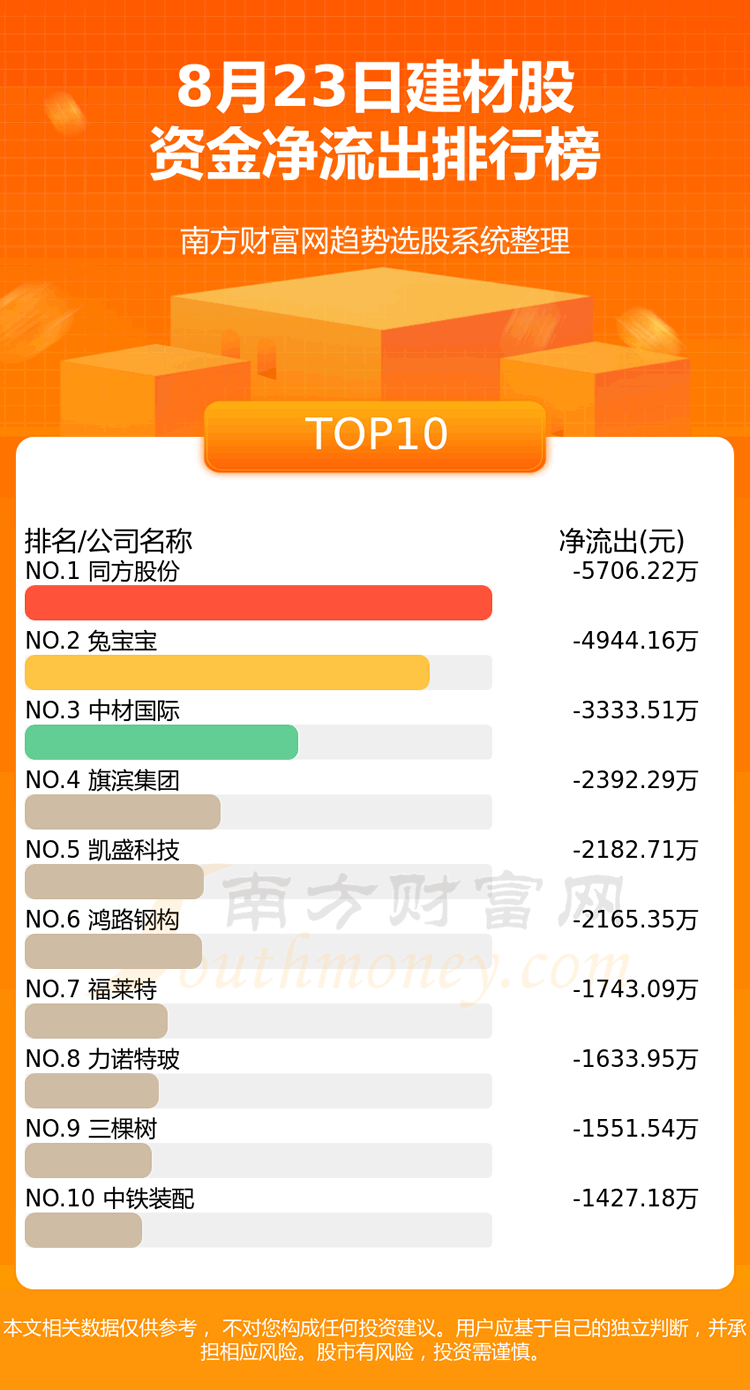 建材股8月23日资金净流出情况来看,同方股份位列第一位,主力净流出达到-5706.22万元;兔宝宝排名第二,主力净流出为-4944.16万元;中材国际排名第三,主力净流出-3333.51万元。主力净流出排名前10的还有:旗滨集团、凯盛科技、鸿路钢构、福莱特、力诺特玻、三棵树、中铁装配。