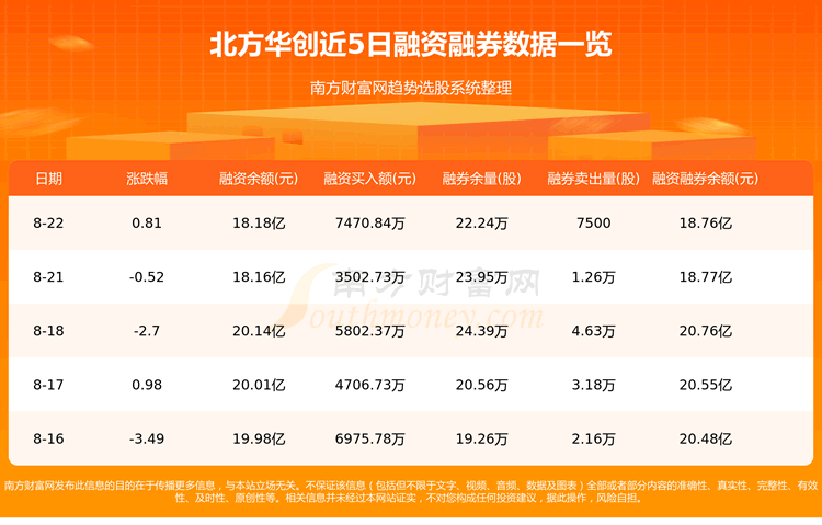 8月22日北方华创融券信息显示,融资方面,当日融资买入7470.84万元,融资偿还7227.69万元,融资净买额243.16万元。融券方面,融券卖出7500股,融券偿还2.46万股,融券余量22.24万股,融券余额5731.59万元。融资融券余额18.76亿元。近5日融资融券数据一览见下表: