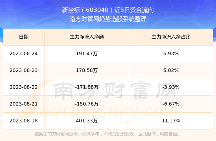 二、新坐标(603040)近期盘面、资金面情况