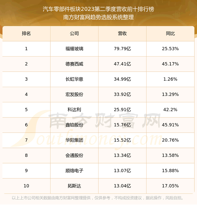 按照趋势选股系统统计,该股所属板块为汽车零部件板块,该板块共有62只股票,新坐标2023第二季度营收在该板块中排名为第62名,该板块2023第二季度营收排名前十的股票如下表: