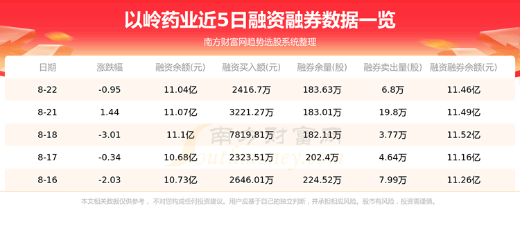 8月22日以岭药业融券信息显示,融资方面,当日融资买入2416.7万元,融资偿还2724.24万元,融资净买额-307.54万元。融券方面,融券卖出6.8万股,融券偿还6.19万股,融券余量183.63万股,融券余额4223.4万元。融资融券余额11.46亿元。近5日融资融券数据一览见下表: