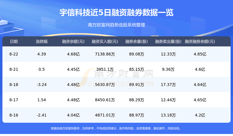 8月22日宇信科技融券信息显示,融资方面,当日融资买入7138.86万元,融资偿还4865.26万元,融资净买额2273.6万元。融券方面,融券卖出12.33万股,融券偿还8.39万股,融券余量89.08万股,融券余额1673.86万元。融资融券余额4.85亿元。近5日融资融券数据一览见下表:
