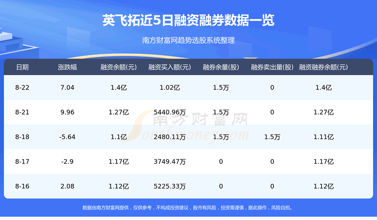 英飞拓8月22日融券信息显示,融资方面,当日融资买入1.02亿元,融资偿还8881.49万元,融资净买额1280.1万元。近5日融资融券数据一览见下表: