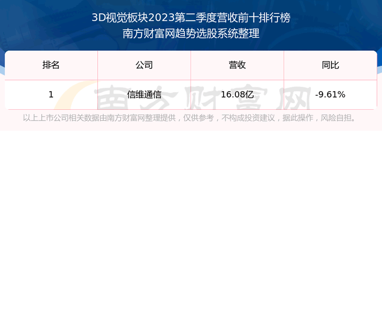 按照趋势选股系统统计,该股所属板块为3D视觉板块,该板块共有1只股票,奥比中光2023第二季度营收在该板块中排名为第1名,该板块2023第二季度营收排名前十的股票如下表: