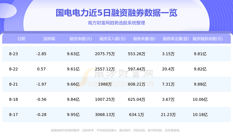 8月23日国电电力融券信息显示,融资方面,当日融资买入2075.75万元,融资偿还1880.78万元,融资净买额194.97万元。融券方面,融券卖出3.15万股,融券偿还47.33万股,融券余量553.26万股,融券余额1886.62万元。融资融券余额9.81亿元。近5日融资融券数据一览见下表: