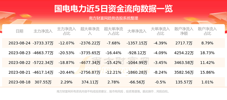 8月24日消息,国电电力资金净流出3733.37万元,超大单资金净流出2376.22万元,换手率0.51% ,成交金额3.09亿元。