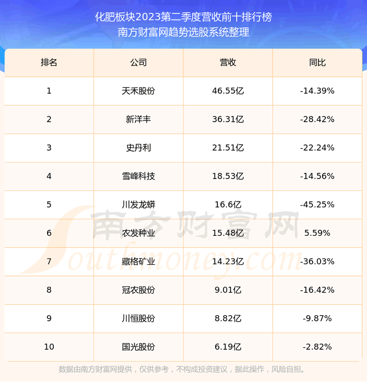 按照趋势选股系统统计,该股所属板块为化肥板块,该板块共有11只股票,农发种业2023第二季度营收在该板块中排名为第6名,该板块2023第二季度营收排名前十的股票如下表: