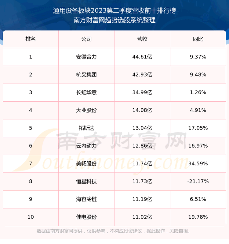 按照趋势选股系统统计,该股所属板块为通用设备板块,该板块共有55只股票,东睦股份2023第二季度营收在该板块中排名为第13名,该板块2023第二季度营收排名前十的股票如下表:
