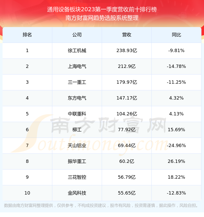 按照趋势选股系统统计,该股所属板块为通用设备板块,该板块共有338只股票,赛福天2023第一季度营收在该板块中排名为第145名,该板块2023第一季度营收排名前十的股票如下表: