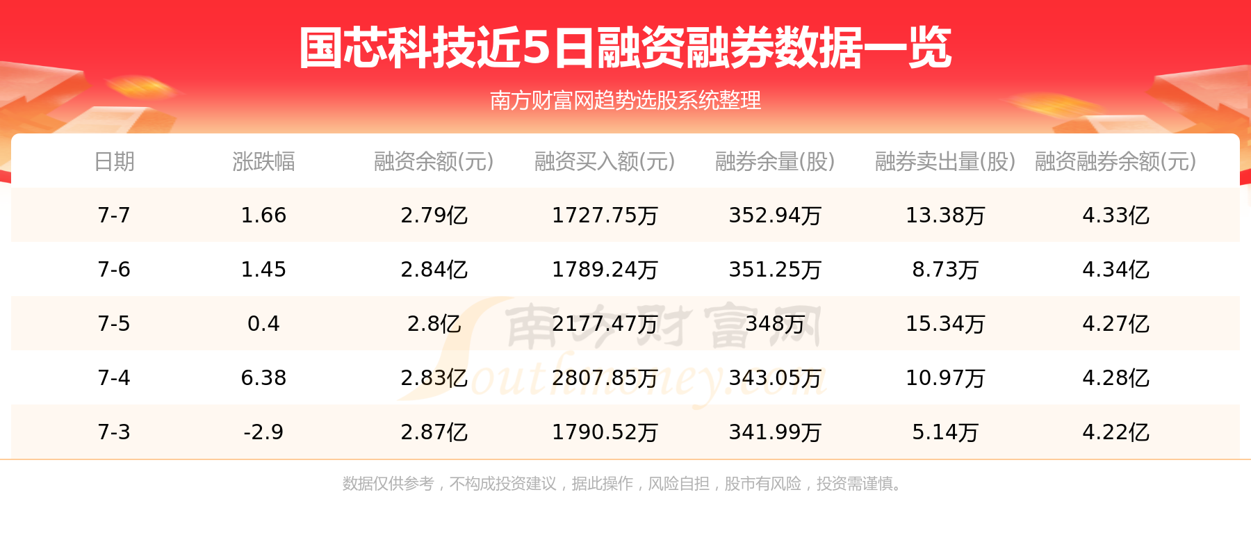 7月7日国芯科技融券信息显示,融资方面,当日融资买入1727.75万元,融资偿还2166.91万元,融资净买额-439.16万元。融券方面,融券卖出13.38万股,融券偿还11.69万股,融券余量352.94万股,融券余额1.54亿元。融资融券余额4.33亿元。近5日融资融券数据一览见下表: