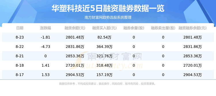 8月23日华塑科技融券信息显示,融资方面,当日融资买入82.54万元,融资偿还112.93万元,融资净买额-30.39万元。近5日融资融券数据一览见下表: