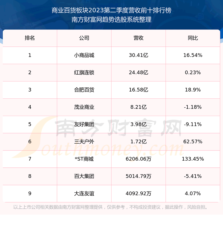 按照趋势选股系统统计,该股所属板块为商业百货板块,该板块共有9只股票,新华百货2023第二季度营收在该板块中排名为第9名,该板块2023第二季度营收排名前十的股票如下表: