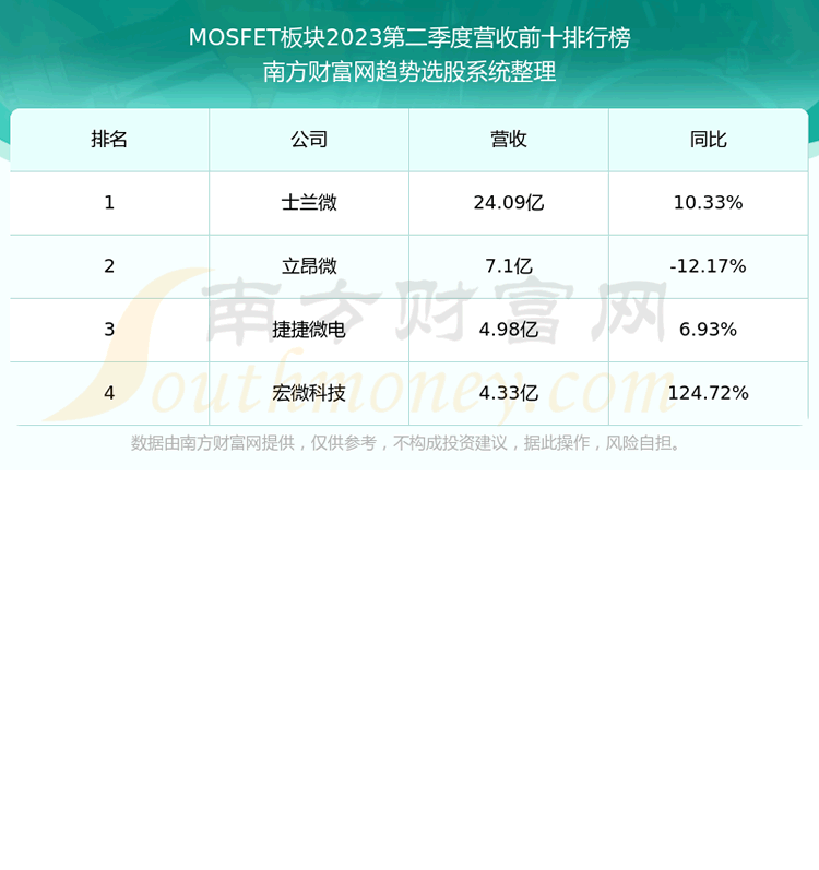 按照趋势选股系统统计,该股所属板块为MOSFET板块,该板块共有4只股票,东微半导2023第二季度营收在该板块中排名为第4名,该板块2023第二季度营收排名前十的股票如下表: