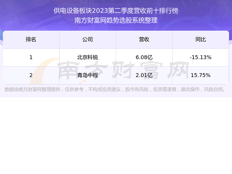 按照趋势选股系统统计,该股所属板块为供电设备板块,该板块共有2只股票,高铁电气2023第二季度营收在该板块中排名为第2名,该板块2023第二季度营收排名前十的股票如下表: