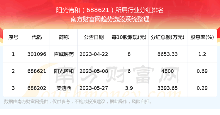 按照趋势选股系统统计,阳光诺和所属行业为药学研究行业,药学研究行业分红排名情况如下表: