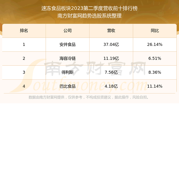 按照趋势选股系统统计,该股所属板块为速冻食品板块,该板块共有4只股票,安井食品2023第二季度营收在该板块中排名为第1名,该板块2023第二季度营收排名前十的股票如下表: