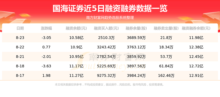 国海证券8月23日融券信息显示,融资方面,当日融资买入2510.3万元,融资偿还5786.85万元,融资净买额-3276.54万元。融券方面,融券卖出21.8万股,融券偿还95.33万股,融券余量3689.59万股,融券余额1.41亿元。融资融券余额11.98亿元。近5日融资融券数据一览见下表: