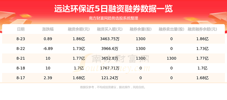 远达环保8月23日融券信息显示,融资方面,当日融资买入3463.75万元,融资偿还2177.06万元,融资净买额1286.68万元。近5日融资融券数据一览见下表: