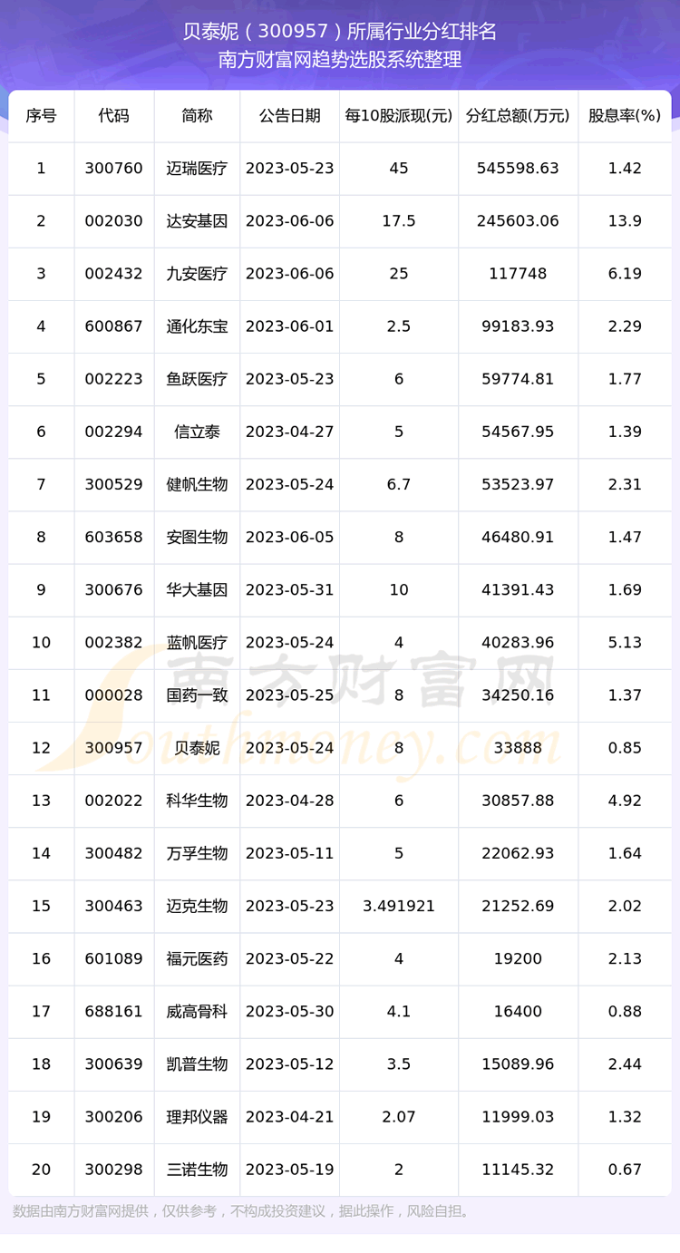 按照趋势选股系统统计,贝泰妮所属行业为护肤品行业,护肤品行业分红排名情况如下表: