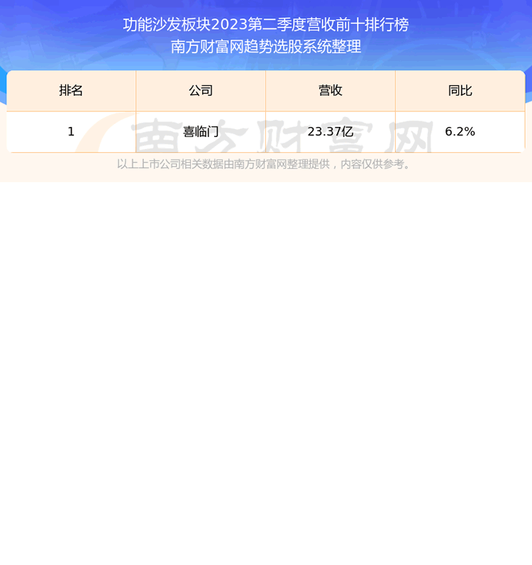 按照趋势选股系统统计,该股所属板块为功能沙发板块,该板块共有1只股票,中源家居2023第二季度营收在该板块中排名为第1名,该板块2023第二季度营收排名前十的股票如下表: