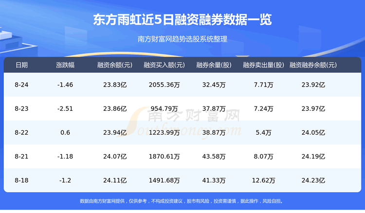 8月24日东方雨虹融券信息显示,融资方面,当日融资买入2055.36万元,融资偿还2326.34万元,融资净买额-270.98万元。融券方面,融券卖出7.71万股,融券偿还13.13万股,融券余量32.45万股,融券余额895.73万元。融资融券余额23.92亿元。近5日融资融券数据一览见下表: