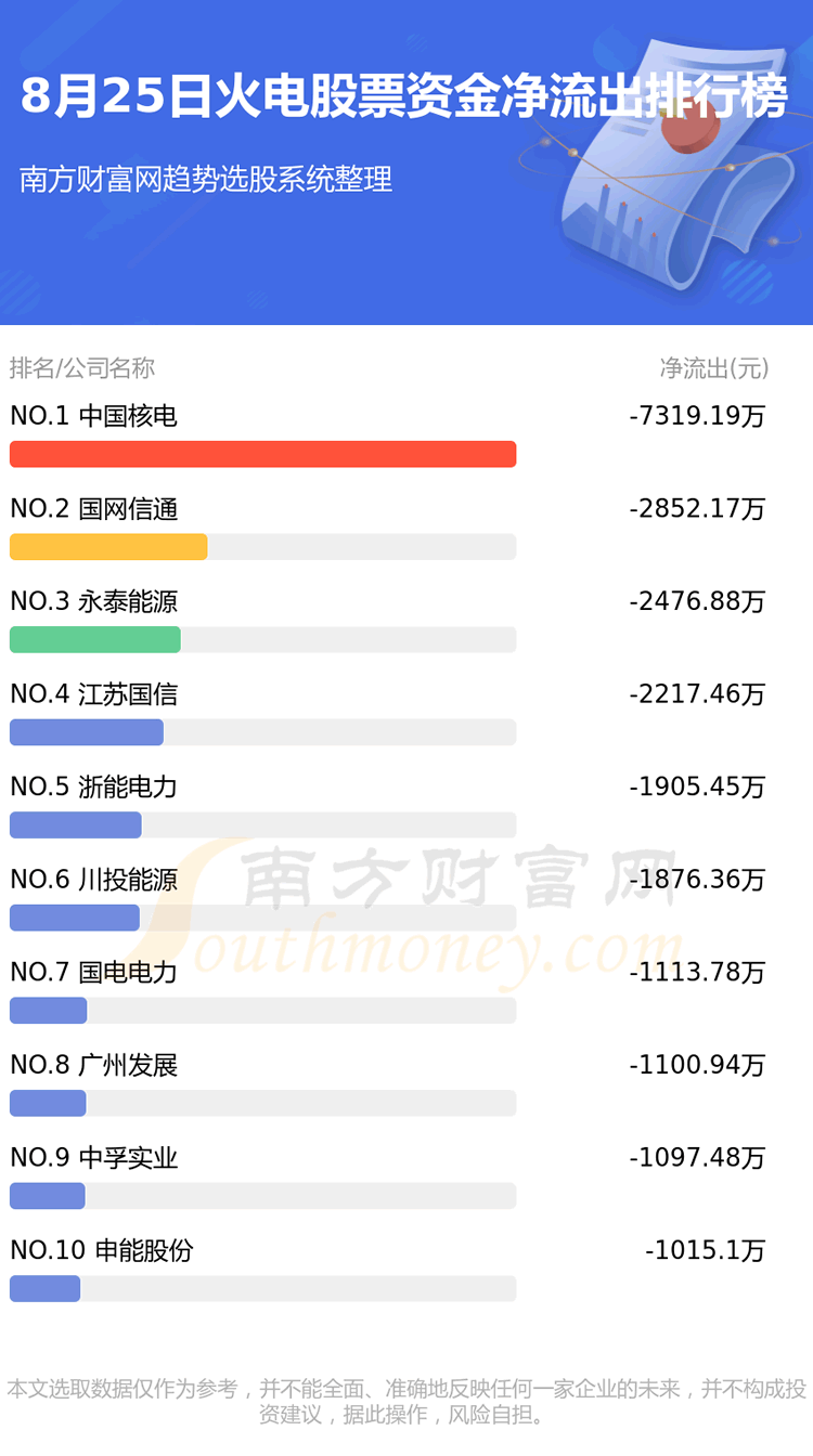 火电股票8月25日资金净流出情况来看,中国核电位列第一位,主力净流出达到-7319.19万元;国网信通排名第二,主力净流出为-2852.17万元;永泰能源排名第三,主力净流出-2476.88万元。主力净流出排名前10的还有:江苏国信、浙能电力、川投能源、国电电力、广州发展、中孚实业、申能股份。
