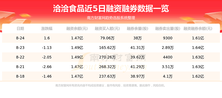 8月24日洽洽食品融券信息显示,融资方面,当日融资买入79.06万元,融资偿还216.18万元,融资净买额-137.12万元。融券方面,融券卖出9300股,融券偿还4.24万股,融券余量38万股,融券余额1420.71万元。融资融券余额1.61亿元。近5日融资融券数据一览见下表: