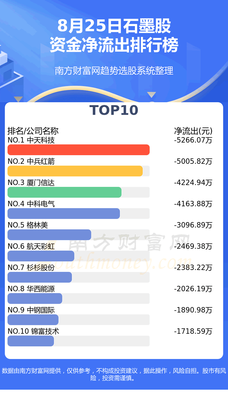 石墨股8月25日资金净流出情况来看,中天科技位列第一位,主力净流出达到-5266.07万元;中兵红箭排名第二,主力净流出为-5005.82万元;厦门信达排名第三,主力净流出-4224.94万元。主力净流出排名前10的还有:中科电气、格林美、航天彩虹、杉杉股份、华西能源、中钢国际、锦富技术。