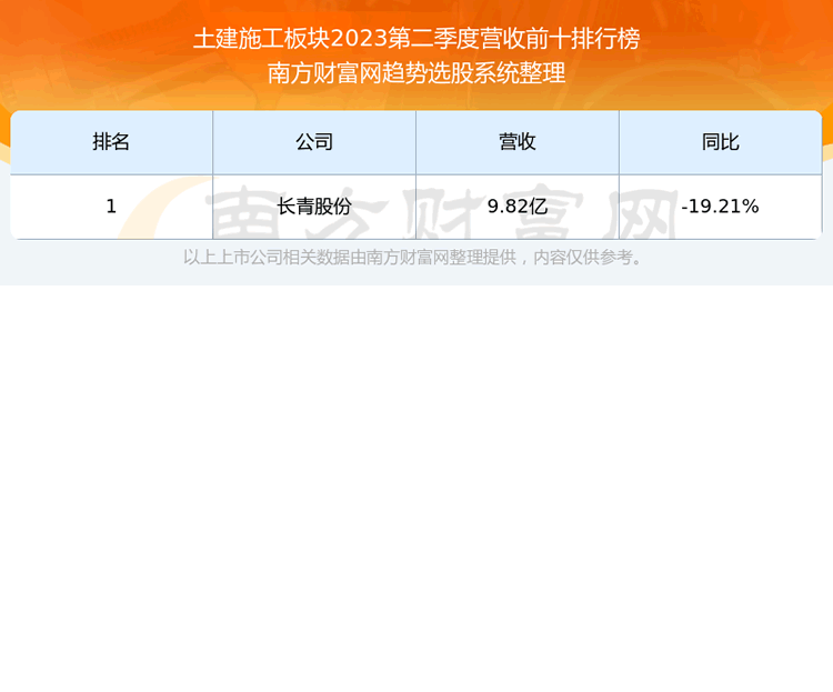 按照趋势选股系统统计,该股所属板块为土建施工板块,该板块共有1只股票,龙元建设2023第二季度营收在该板块中排名为第1名,该板块2023第二季度营收排名前十的股票如下表: