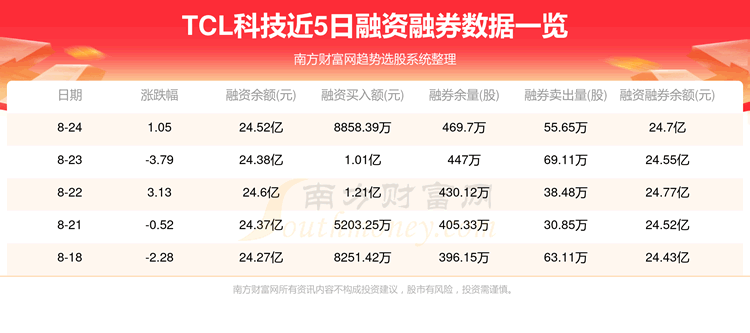 TCL科技8月24日融券信息显示,融资方面,当日融资买入8858.39万元,融资偿还7459.12万元,融资净买额1399.28万元。融券方面,融券卖出55.65万股,融券偿还32.95万股,融券余量469.7万股,融券余额1808.35万元。融资融券余额24.7亿元。近5日融资融券数据一览见下表: