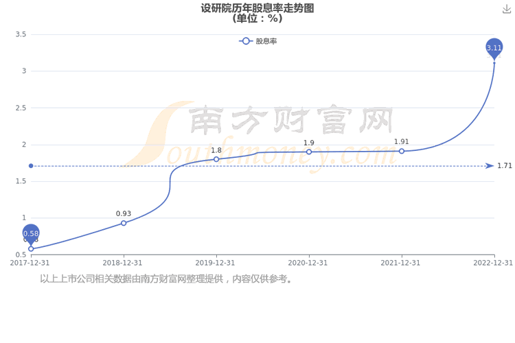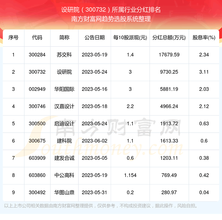 按照趋势选股系统统计,设研院所属行业为工程咨询服务行业,工程咨询服务行业分红排名情况如下表: