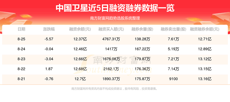 中国卫星8月25日融券信息显示,融资方面,当日融资买入4767.31万元,融资偿还5652.35万元,融资净买额-885.04万元。融券方面,融券卖出7.61万股,融券偿还36.54万股,融券余量138.28万股,融券余额3374.15万元。融资融券余额12.71亿元。近5日融资融券数据一览见下表: