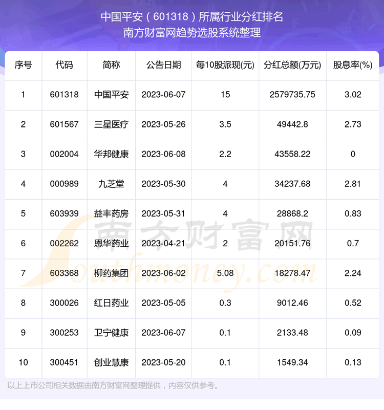按照趋势选股系统统计,中国平安所属行业为保险行业,保险行业分红排名情况如下表: