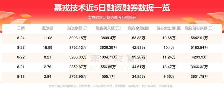 8月24日嘉戎技术融券信息显示,融资方面,当日融资买入3809.4万元,融资偿还3678.38万元,融资净买额131.02万元。融券方面,融券卖出19.65万股,融券偿还9.26万股,融券余量53.33万股,融券余额1919.76万元。融资融券余额5842.91万元。近5日融资融券数据一览见下表: