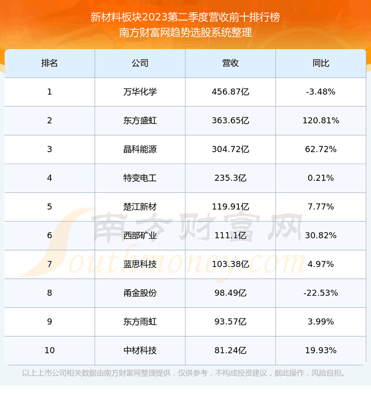 按照趋势选股系统统计,该股所属板块为新材料板块,该板块共有117只股票,阿科力2023第二季度营收在该板块中排名为第117名,该板块2023第二季度营收排名前十的股票如下表:
