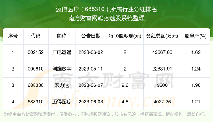 按照趋势选股系统统计,迈得医疗所属行业为医用耗材行业,医用耗材行业分红排名情况如下表:
