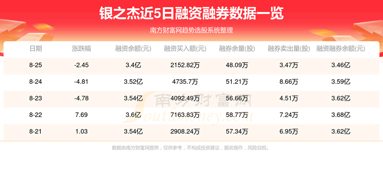 银之杰8月25日融券信息显示,融资方面,当日融资买入2152.82万元,融资偿还3370.6万元,融资净买额-1217.78万元。融券方面,融券卖出3.47万股,融券偿还6.59万股,融券余量48.09万股,融券余额631.39万元。融资融券余额3.46亿元。近5日融资融券数据一览见下表: