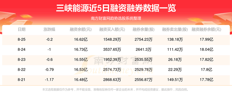 8月25日三峡能源融券信息显示,融资方面,当日融资买入1548.29万元,融资偿还2593.23万元,融资净买额-1044.94万元。融券方面,融券卖出138.18万股,融券偿还25.25万股,融券余量2754.23万股,融券余额1.36亿元。融资融券余额17.99亿元。近5日融资融券数据一览见下表: