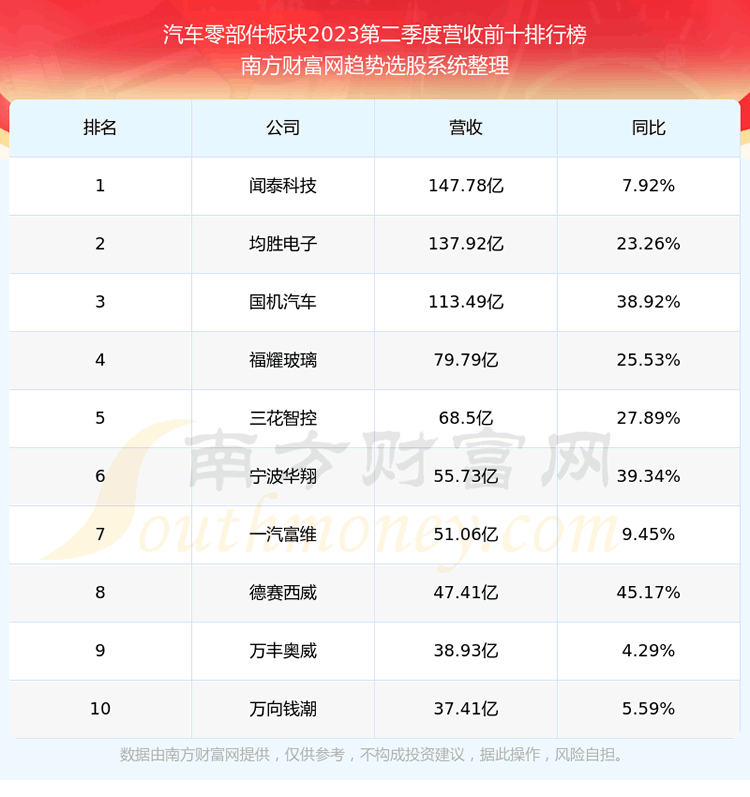 按照趋势选股系统统计,该股所属板块为汽车零部件板块,该板块共有200只股票,宁波高发2023第二季度营收在该板块中排名为第134名,该板块2023第二季度营收排名前十的股票如下表: