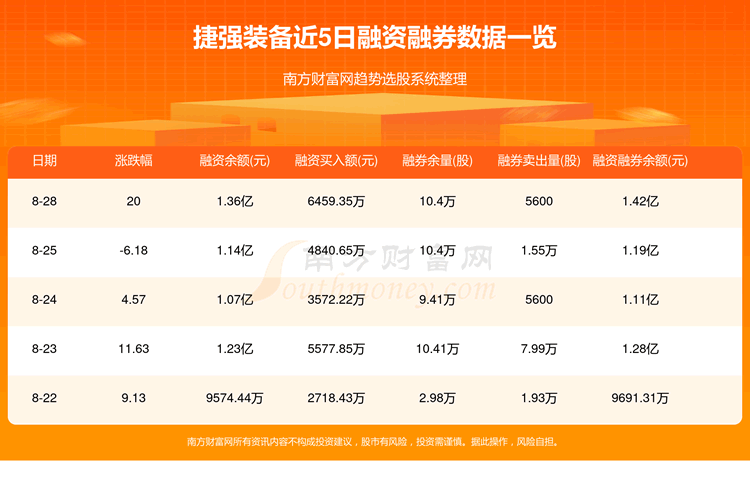 捷强装备8月28日融券信息显示,融资方面,当日融资买入6459.35万元,融资偿还4272.96万元,融资净买额2186.39万元。融券方面,融券卖出5600股,融券偿还5600股,融券余量10.4万股,融券余额536.07万元。融资融券余额1.42亿元。近5日融资融券数据一览见下表: