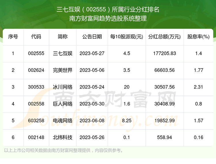 按照趋势选股系统统计,三七互娱所属行业为网络游戏行业,网络游戏行业分红排名情况如下表: