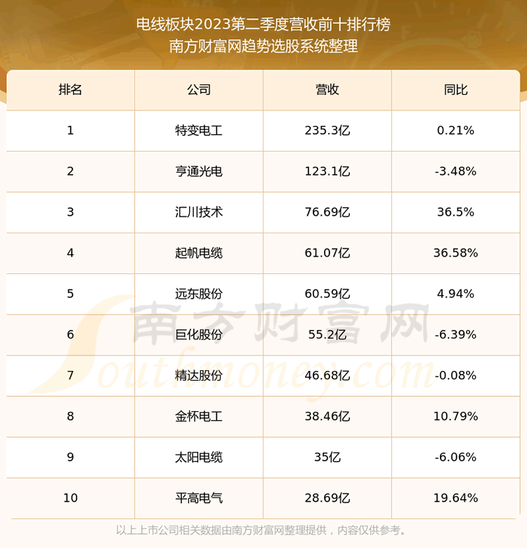 按照趋势选股系统统计,该股所属板块为电线板块,该板块共有32只股票,华通线缆2023第二季度营收在该板块中排名为第32名,该板块2023第二季度营收排名前十的股票如下表: