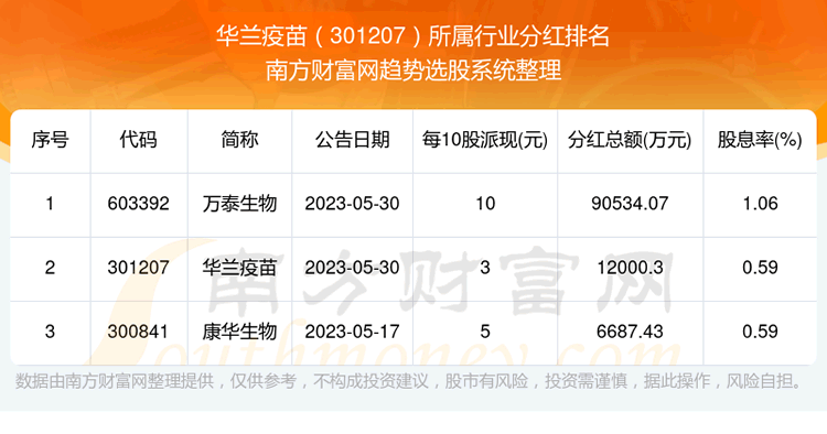 按照趋势选股系统统计,华兰疫苗所属行业为疫苗行业,疫苗行业分红排名情况如下表:
